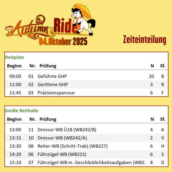 Zeiteinteilung, Pferdeliste für unseren „AutumnRide 2025“ online